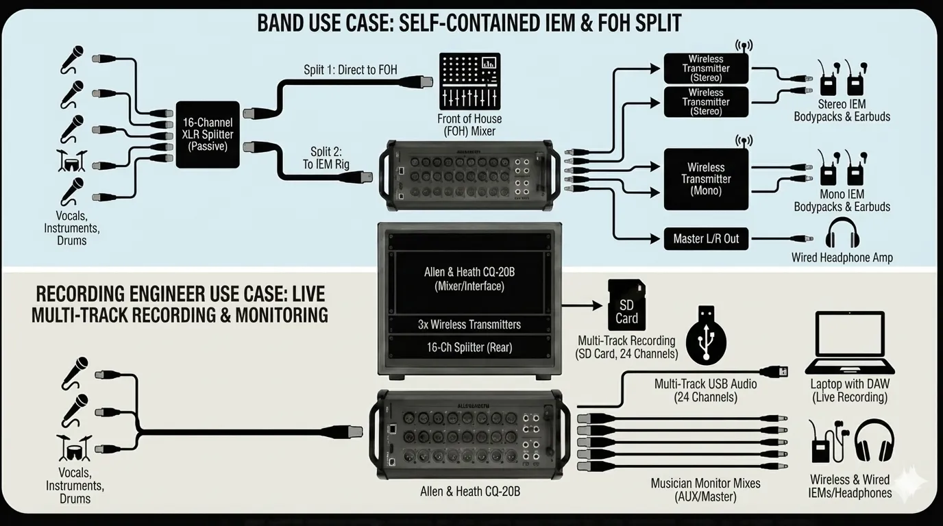 - Step 4: Zero-Latency Monitoring: While you record, the band can still use the wireless/wired outputs to hear themselves with zero latency.